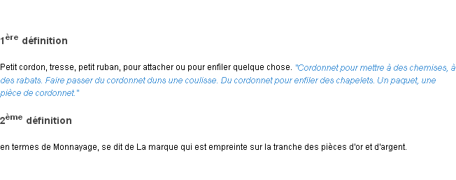 Ancienne signification développée en 1798 par l’académie Française (ACAD - 1798).Merci à Béatrice et Christelle pour la numérisation du mot cordonnet.