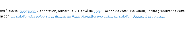 Signification éditée en 2008 pour le terme « cotation » par l’équipe de wiktionary France.Merci à Sidonie et éloise pour la numérisation du mot cotation.