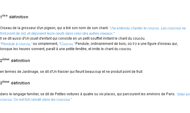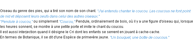 Ancienne signification développée en 1798 par l’académie Française (ACAD - 1798).Merci à Aurelien et Sandrine pour la numérisation du mot coucou.