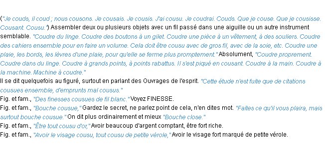 Signification du terme « coudre », parution de 1932, dictionnaire académique Français.