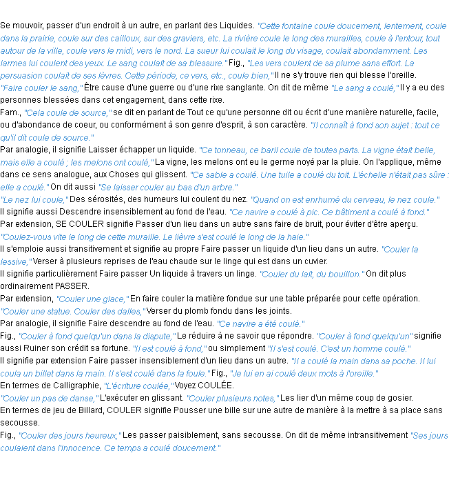 Ancienne définition académique pour le terme « couler » (parue en 1798).