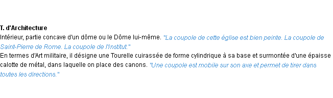 Ancienne signification développée en 1798 par l’académie Française (ACAD - 1798).Merci à Claudine et Cécile pour la numérisation du mot coupole.