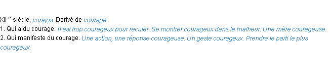 Ancienne définition de l’Académie Française (édition de 1798) pour le mot « courageux ».Merci à Gaétan et émile pour la numérisation du mot courageux.