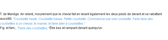 Signification développée en 1788 par Mr Féraud (dictionnaire dit « le Féraud »).Merci à Julienne et Seraphine pour la numérisation du mot courbette.