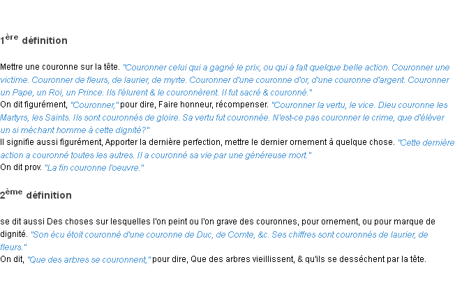 Ancienne définition de « couronner » de source académique (Académie Française, parution de 17962).Merci à Aimée et Claire pour la numérisation du mot couronner.