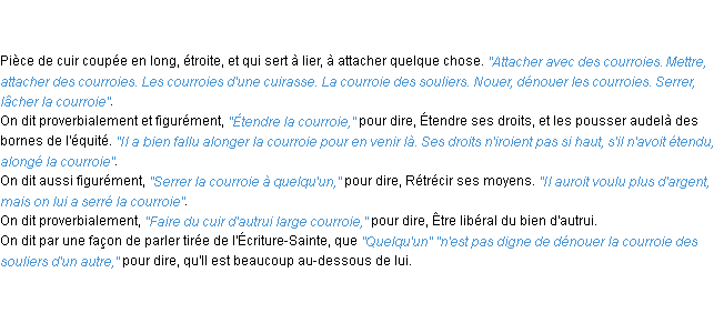 Ancienne signification issue du dico de l’Académie Française, parue en 1798.Merci à Yolande et Adrien pour la numérisation du mot courroie.