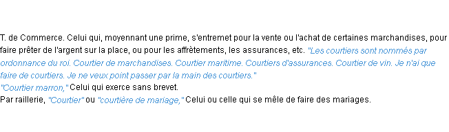 Ancienne signification développée en 1798 par l’académie Française (ACAD - 1798).Merci à Pascal et Germain pour la numérisation du mot courtier.