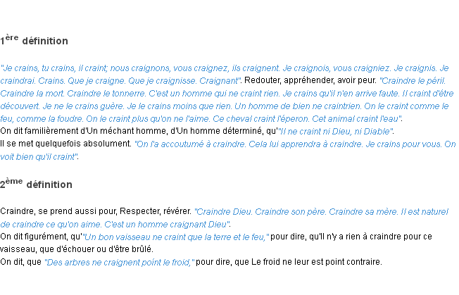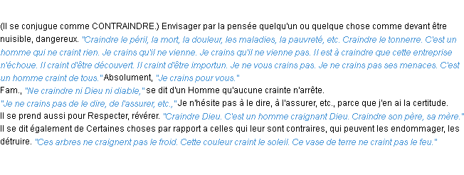 Ancienne signification du terme « craindre », parution de 1835, dictionnaire académique Français.