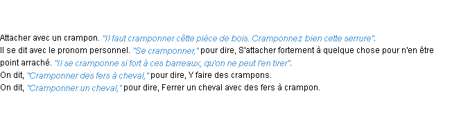 Ancienne signification parue en 1798 dans dictionnaire de l’Académie Française.Merci à Jolie et Odile pour la numérisation du mot cramponner.