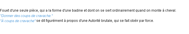 Définition du mot « cravache » par l’équipe de la-definition.fr (édition de 2011).Merci à Suzette et Armel pour la numérisation du mot cravache.