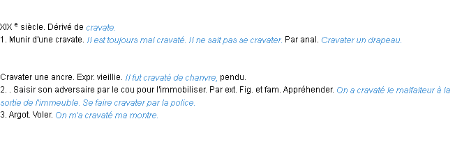 Signification développée en 1876 par Mr Littré (dictionnaire dit d’Emile Littré).Merci à Stéphanie et Rémi pour la numérisation du mot cravater.