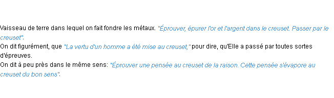 Ancienne signification du terme « creuset », parution de 1835, dictionnaire académique Français.