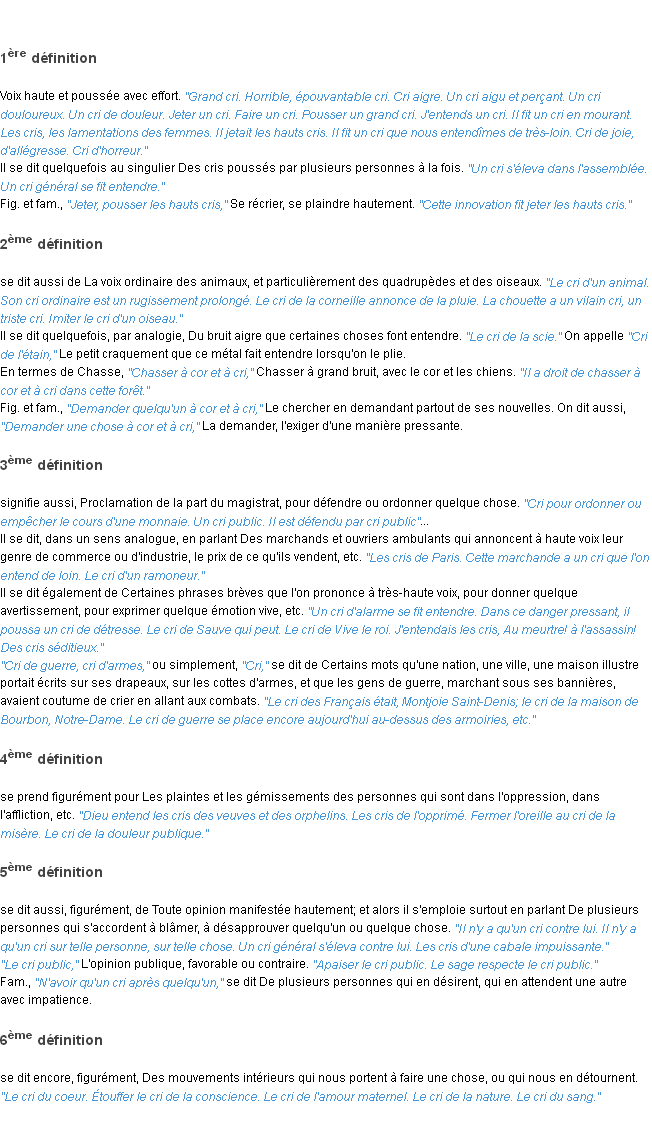 Définition « cri » du dictionnaire académique Français, parution de l’année 1932.