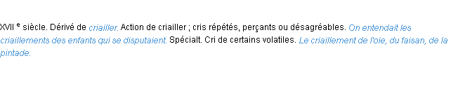 Signification parue en 1986 dans dictionnaire de l’Académie Française.Merci à Fernand et Aimée pour la numérisation du mot criaillement.