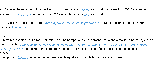 Ancienne signification issue du dico de l’Académie Française, parue en 1798.Merci à Marguerite et Adélaïde pour la numérisation du mot croche.