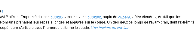 Définition de l’équipe de la-definition.fr (édition de 2009) pour le mot « cubitus ».Merci à Amélie et Hercule pour la numérisation du mot cubitus.