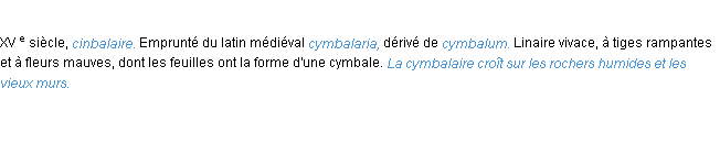 Signification développée en 1876 par Mr Littré (dictionnaire dit d’Emile Littré).Merci à Faustine et Armand pour la numérisation du mot cymbalaire.