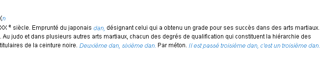 Signification éditée en 2008 pour le terme « dan » par l’équipe de wiktionary France.Merci à Michèle et Franck pour la numérisation du mot dan.