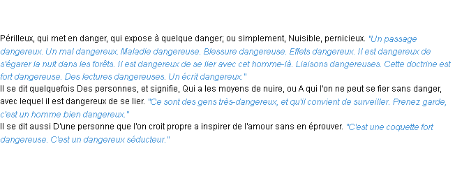Ancienne définition de l’Académie Française (édition de 1835) pour le mot « dangereux ».