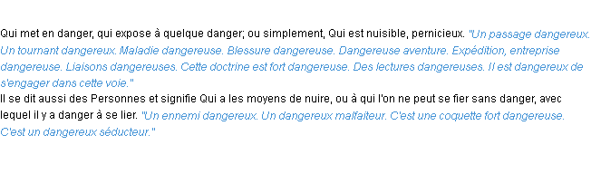 Définition de « dangereux » de source académique (Académie Française, parution de 1986).