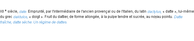 Ancienne signification développée en 1798 par l’académie Française (ACAD - 1798).Merci à Apolline et Paule pour la numérisation du mot datte.