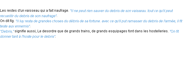 Ancienne signification développée en 1694 par l’académie Française (ACAD - 1694).Merci à Fifi et Emmanuelle pour la numérisation du mot debris.