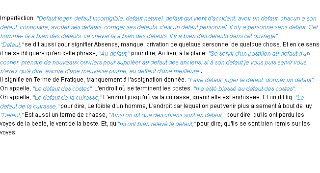 Ancienne définition développée dans dictionnaire académique, 1694.Merci à Arnaude et émilie pour la numérisation du mot defaut.