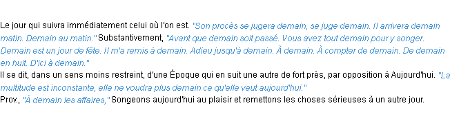 Ancienne définition de l’Académie Française (édition de 1835) pour le mot « demain ».