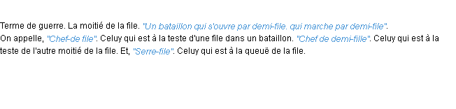 Ancienne signification développée en 1694 par l’académie Française (ACAD - 1694).Merci à Maximilien et Honoré pour la numérisation du mot demi-file.