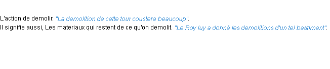 Ancienne définition de l’Académie Française (édition de 1694) pour le mot « demolition ».Merci à Benoit et Josiane pour la numérisation du mot demolition.