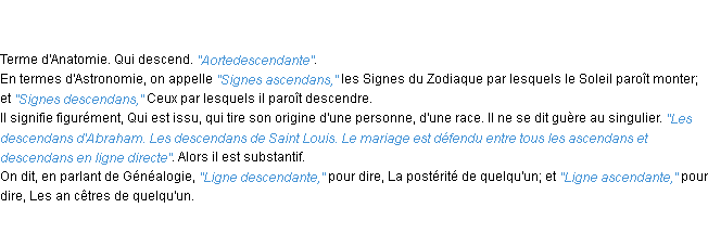Signification du terme « descendant », parution de 1932, dictionnaire académique Français.