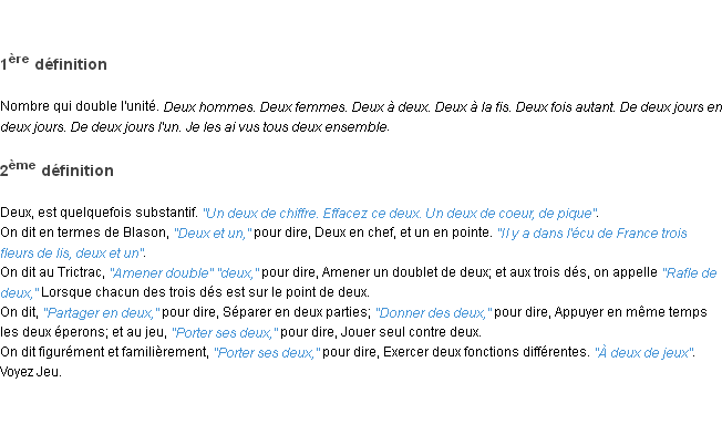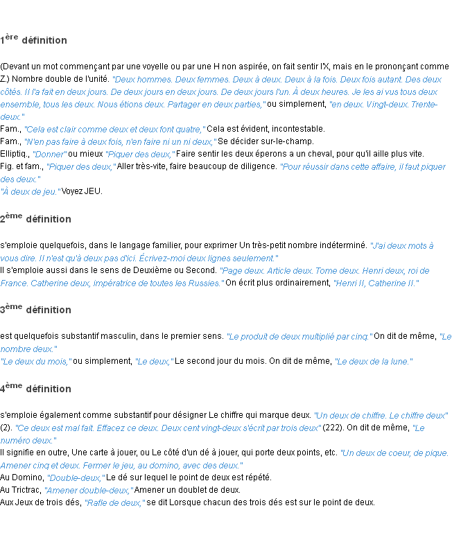 Signification éditée en 2010 par l’équipe de la-definition.fr.Merci à Rémy et Bernadette pour la numérisation du mot deux.