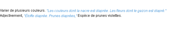 Ancienne signification parue en 1835 dans dictionnaire de l’Académie Française.Merci à Hugues et Nicolas pour la numérisation du mot diaprer.