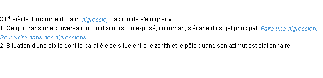 Ancienne signification parue en 1798 dans dictionnaire de l’Académie Française.Merci à Clementine et Thierry pour la numérisation du mot digression.