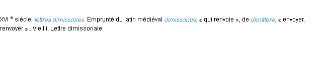 Signification du terme « dimissoire », parution de 1986, dictionnaire académique Français.