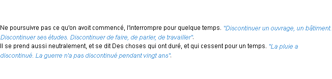 Ancienne signification éditée en 1835 pour le terme « discontinuer » par l’Académie Française.