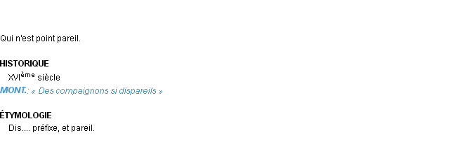 Signification développée en 1876 par Mr Littré (dictionnaire dit d’Emile Littré).Merci à Delphine et Ambre pour la numérisation du mot dispareil.