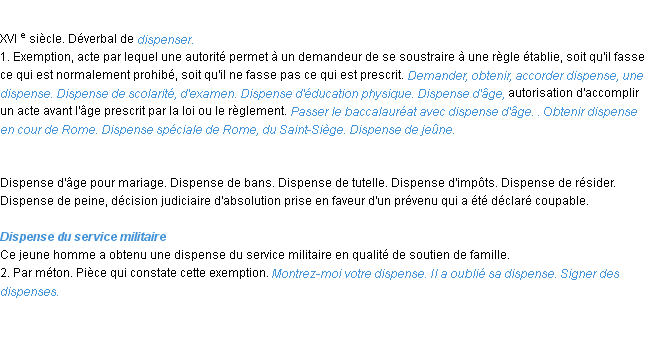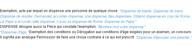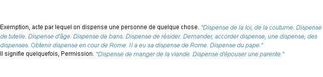 Ancienne signification développée en 1798 par l’académie Française (ACAD - 1798).Merci à Sylvaine et Gautier pour la numérisation du mot dispense.