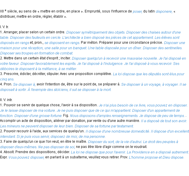 Ancienne signification issue du dico de l’Académie Française, parue en 1798.Merci à Sidonie et Mireille pour la numérisation du mot disposer.