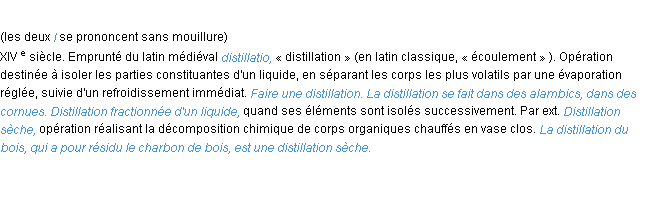 Définition de « distillation » de source académique (Académie Française, parution de 1932).
