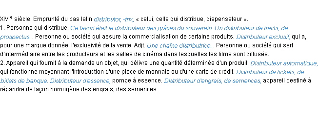 Signification du terme « distributeur », parution de 1986, dictionnaire académique Français.