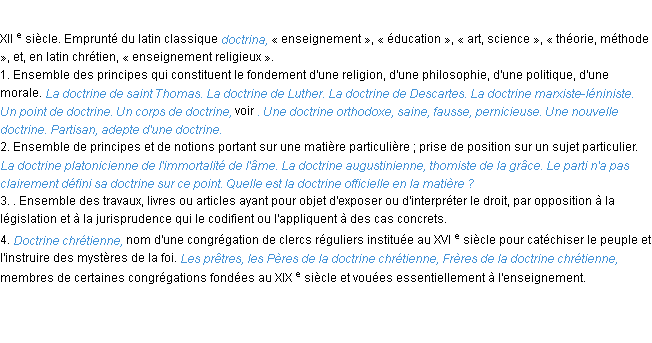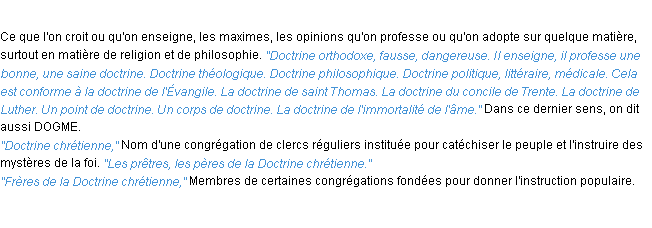 Ancienne signification développée en 1798 par l’académie Française (ACAD - 1798).Merci à Noémie et Honorine pour la numérisation du mot doctrine.