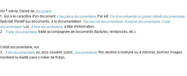 Signification éditée en 2008 pour le terme « documentaire » par l’équipe de wiktionary France.Merci à Géraud et Franck pour la numérisation du mot documentaire.