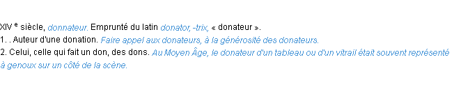 Signification éditée en 2008 pour le terme « donateur » par l’équipe de wiktionary France.Merci à Juliette et Jourdain pour la numérisation du mot donateur.
