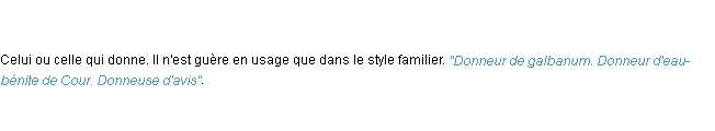 Ancienne signification éditée en 1798 pour le terme « donneur » par l’Académie Française.Merci à Marguerite et Antoine pour la numérisation du mot donneur.
