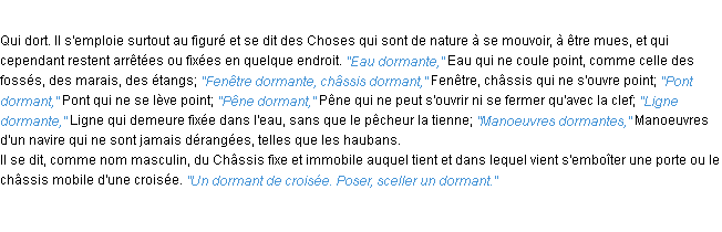 Ancienne signification du terme « dormant », parution de 1835, dictionnaire académique Français.