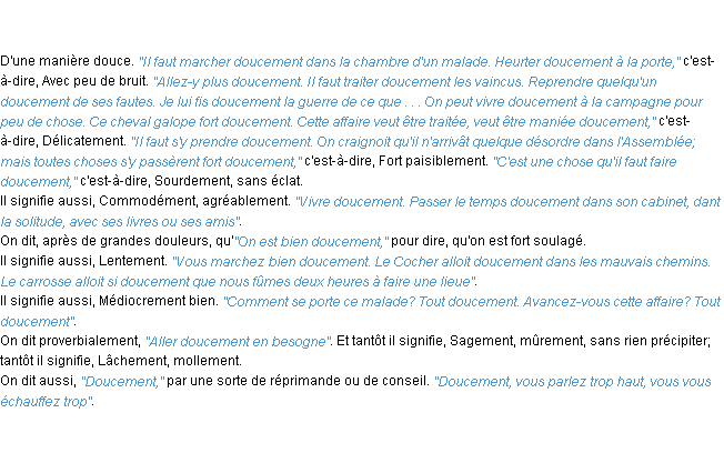 Ancienne signification éditée en 1835 pour le terme « doucement » par l’Académie Française.