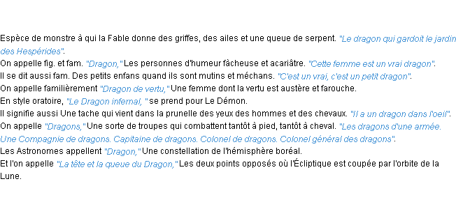 Ancienne signification développée en 1798 par l’académie Française (ACAD - 1798).Merci à Yves et Luce pour la numérisation du mot dragon.