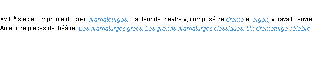 Signification éditée en 2010 par l’équipe de la-definition.fr.Merci à Noella et Virginie pour la numérisation du mot dramaturge.