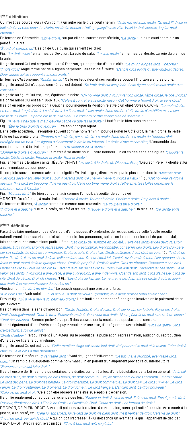 Ancienne définition de « droit » de source académique (Académie Française, parution de 1798).
